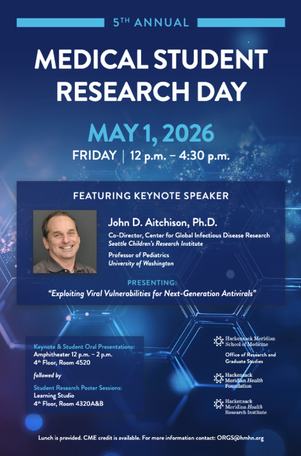 Each spring, this annual event hosts a notable Keynote Speaker, two Featured Student Presentations, and showcases over 150 Student Digital Research Posters. Medical Student Research Day is co-sponsored by the Office of Research and Graduate Studies, the Hackensack Meridian School of Medicine, the Hackensack Meridian Health Research Institute, and the Hackensack Meridian Health Foundation.